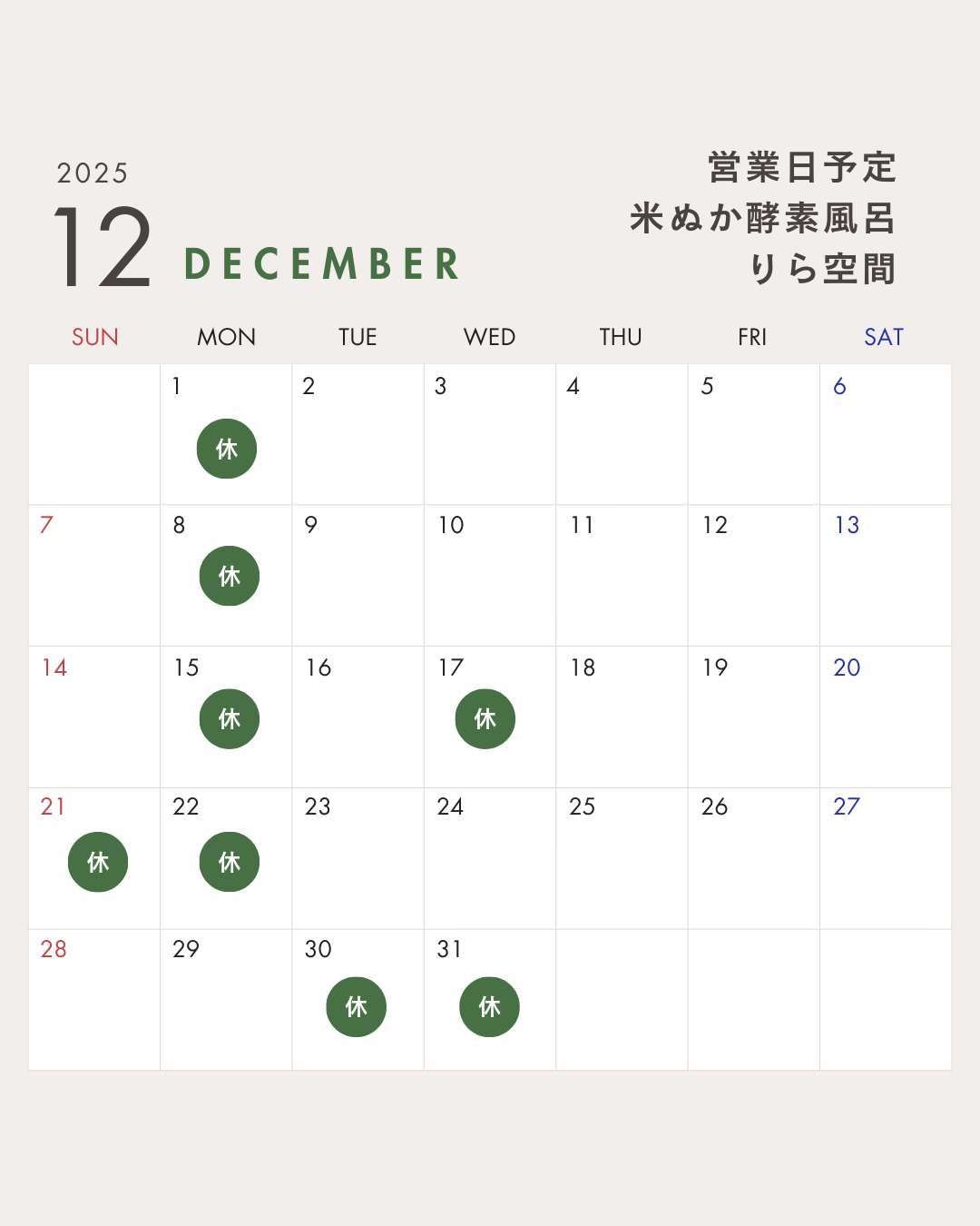 米ぬか酵素風呂は電気やガスなどの動力を使わず、前日のお客様のご予約人数などを考慮し、米ぬかや水の量の調節をし、何時間もかけお手入れをし発酵させ熱源を生み出しています。酵素風呂は当日利用できるお客様の人数に限りがあり。そのため施術メニューや状況に合わせ予約時間の設定をしております。